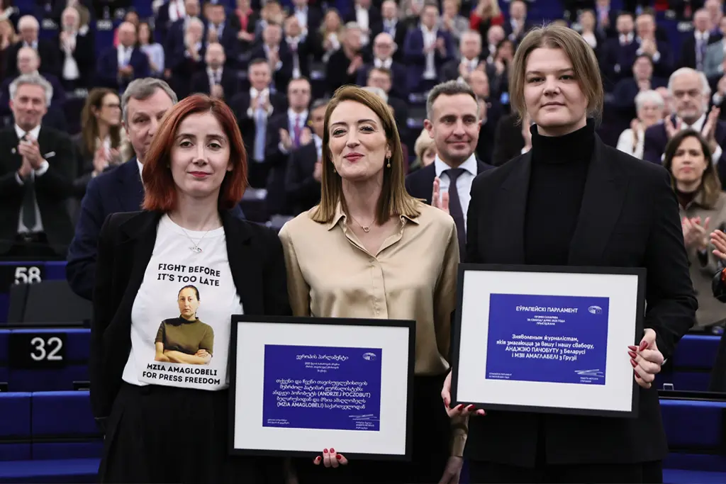«Я горжусь тем, что в этом году присуждаю Премию Сахарова журналистам Андрею Почобуту и Мзии Амаглобели в знак признания их мужественной борьбы за свободу слова и демократическое будущее Беларуси и Грузии. Этот парламент выражает солидарность с Мзией и Андреем и призывает к их немедленному освобождению — потому что говорить правду власти никогда не должно быть преступлением».